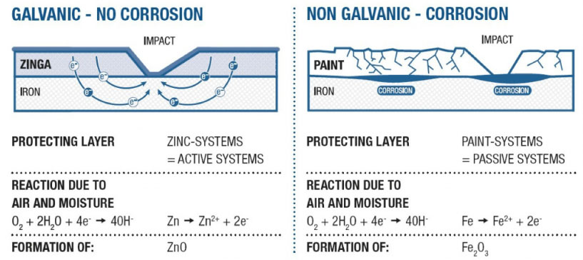 The zinc in Zinga becomes the sacrificial anode in relation to the steel but it corrodes at a much slower rate than would otherwise be expected